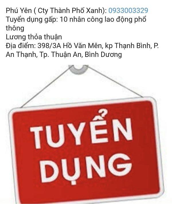 Thành Phố Xanh (TPX) do nhu cầu mở rộng sản xuất trong năm 2021, Công ty đang cần tuyển dụng gấp lao động phổ thông từ ngày 29-3-2021 tại địa chỉ: Số 398/3A, Đường Hồ Văn Mên, Khu phố Thạnh Bình, Phường An Thạnh, Thành phố Thuận An, tỉnh Bình Dương. Liên hệ: Ms Phú Yên (Zalo/Hotline: 0933003329)
